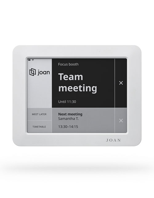 • Timetable: Pull up the meeting room schedule right at the conference room door. Press “Timetable” on JOAN’s display and take a look at the meetings coming up in real time.